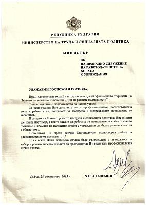 Г-жа Фандъкова изпрати поздравителен адрес за своята подкрепа и съпричастност към каузата на изложението. Поздравителен адрес беше получен и от министъра на труда и социалната политика д-р Хасан Адемов.