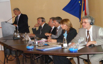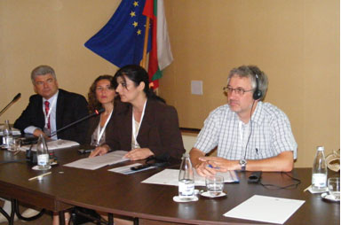 Г.Георгиев, Ирина Папанчева – представител на РБългария в Европейския форум на хората с увреждания, Жос Тюис – председател на Агецията за хората с увреждания на Фламандската общност, Елка Тодорова - председател на Националната федерация на работодателите на инвалиди, отговаря изчерпателно на въпрос от аудиторията